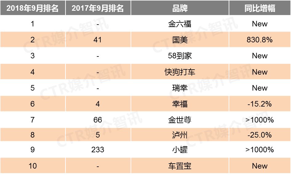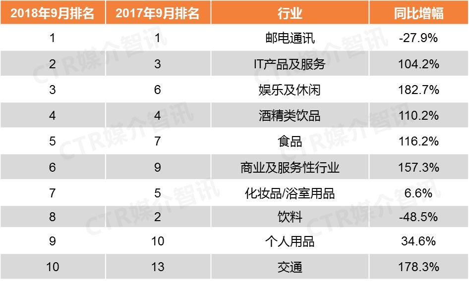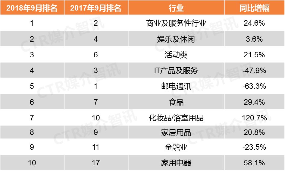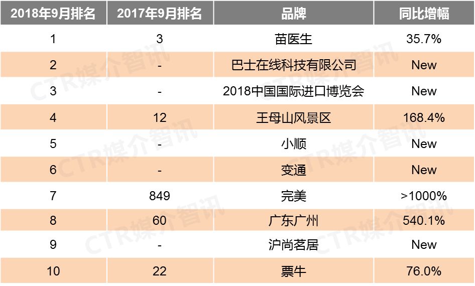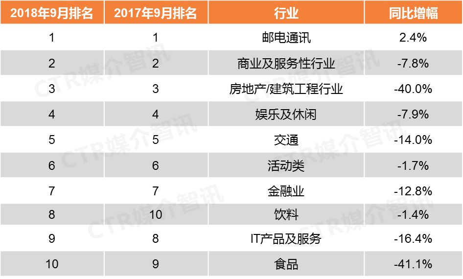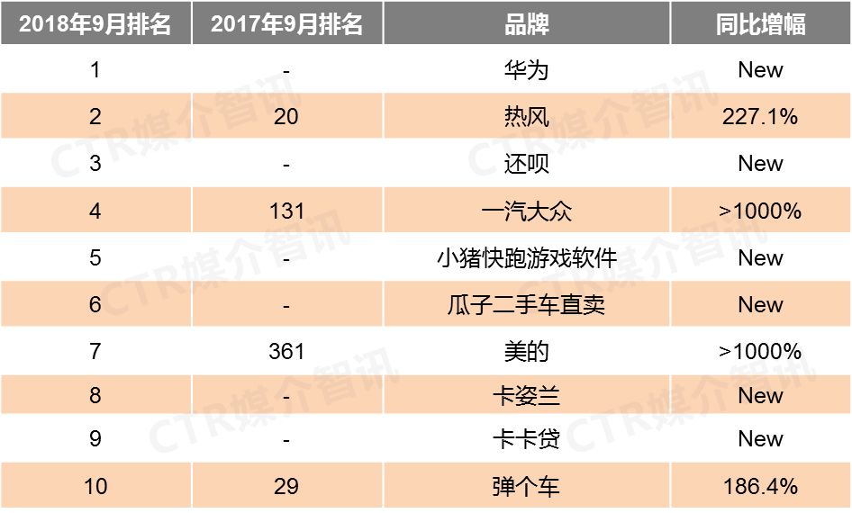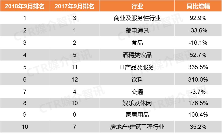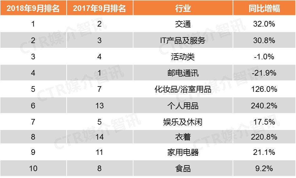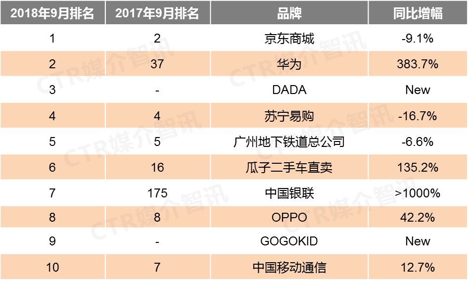 CTR媒介智讯最新发布的9月户外广告榜单显示出这些主要特点:
