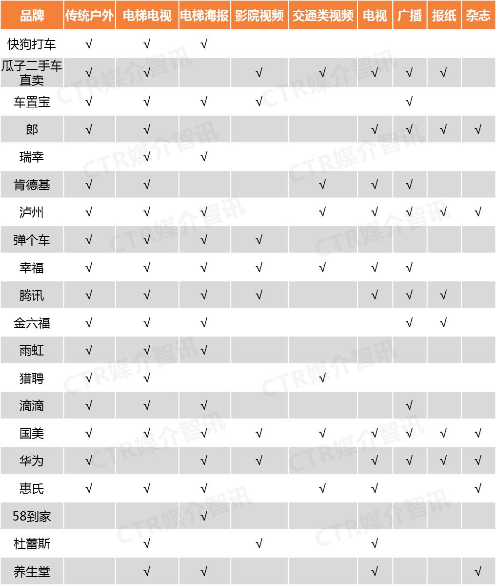 一、在户外渠道的选择上,品牌投放相对集中。户外渠道中,排名前20的品牌除58到家和华为以外,其余品牌均选择了电梯电视媒体进行投放,同为生活圈媒体的电梯海报渠道,也吸引了榜单中75%的品牌。