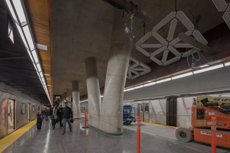 Pioneer Village Station 地铁站坐落于多伦多 Steels Avenue 和 Northwest Gate 交叉口的斜对面。柏林艺术家 Jan Edler 被 Pioneer Village Station 委托负责公共艺术的部分。他以用高科技的媒体技术著称,对立面的概念和像素的性质以及它们如何分解成图像感兴趣。艺术家们与建筑设计团队合作密切,并且为一个名叫 “Lightspell”的公共艺术提供了新的概念。