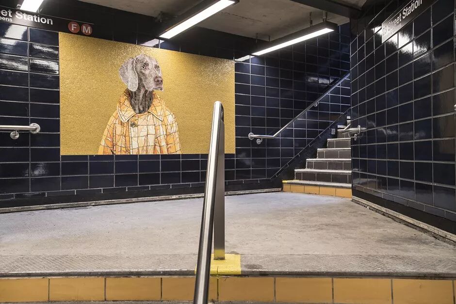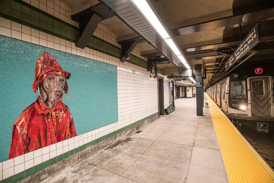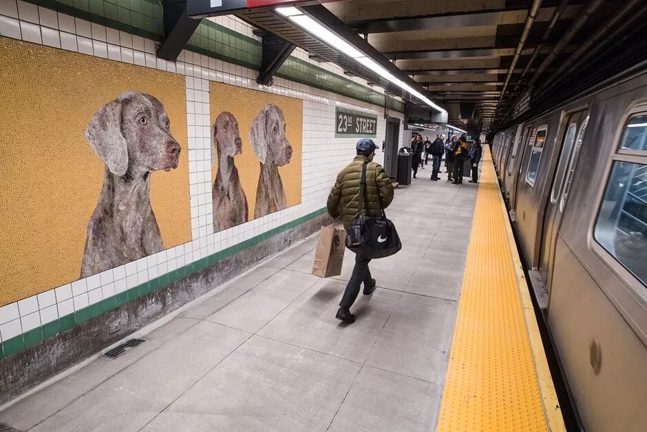 美国艺术家 Willianm Wegman 拍摄自己宠物狗的摄影作品,也出现在了纽约“第 23 街”地铁站,用的是马赛克拼贴的形式,装饰的目的是让经过这里的忙碌旅客片刻放松。