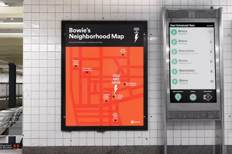 音乐流媒体 Spotify 和布鲁克林博物馆合作发起了 #DavidBowieIsHere 活动,他们用 David Bowie 音乐生涯中的经典照片、海报和巨型肖像画和支持者们制作的艺术品装点了纽约地铁站,以纪念 David 对音乐、时尚和文化的影响,也让这位来自伦敦的摇滚传奇成了纽约市民生活的一部分。