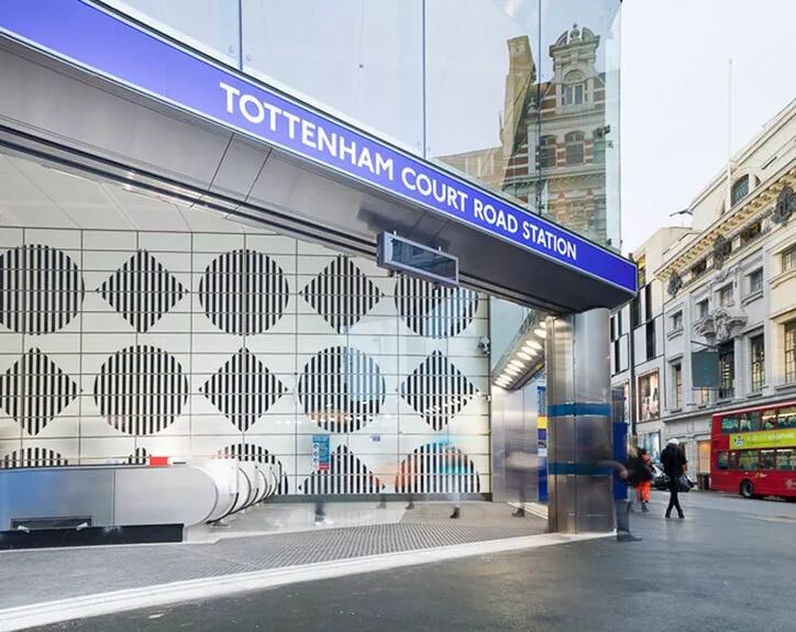 Daniel Buren 给 Totenham Court Road 站的多个出入口分别带来了不同风格的艺术创作。有的是简洁的黑白色条纹几何图形墙,也有同样黑白条纹的墙壁背景,不过因为加入了热烈的橙色、红色、绿色、蓝色的几何图形而显得更活泼的墙壁。不光如此,在售票大厅的玻璃后面,你也能找到这些条纹和圆圈。