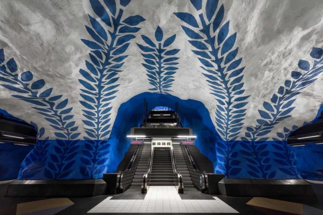在斯德哥尔摩,蓝色调的 T-Central 地铁站是每天客流量最大的一站,进出的乘客接近 17 万人。呈现在地铁站里墙上的蓝色藤蔓图案是由乌尔特韦特 1975 年设计的,选用蓝色的主要目的,是因为这种沉稳的颜色可以起到舒缓乘客焦虑情绪的作用。